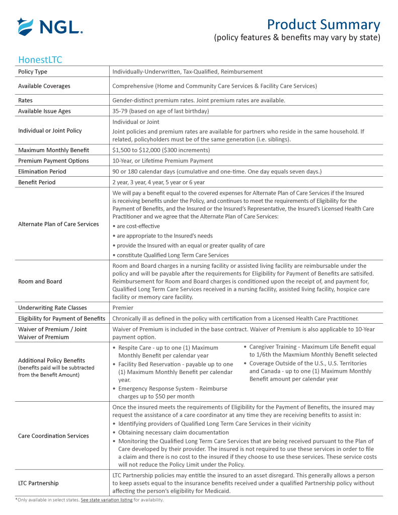 NGL’s new traditional long-term care product that pairs consumer-friendly enhancements with the unique features we’re known for, all without price shock. It’s straightforward and affordable LTC protection with nothing to hide.